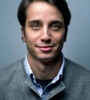 A man is standing on a stage in front of a backdrop with the text 'Social Media Marketing World'. He is wearing a patterned shirt and white pants, gesturing as he speaks. There is a podium with a microphone and two books on it. An audience is seated and listening attentively.